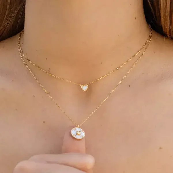 Deze ketting is gemaakt van hypoallergeen edelstaal en wordt op enkele plaatsen onderbroken door een subtiele zirkona. Het hangertje is een klein hart dat ingelegd is met parelmoer. Lengte: ca. 39 cm + 5 cm verlengketting