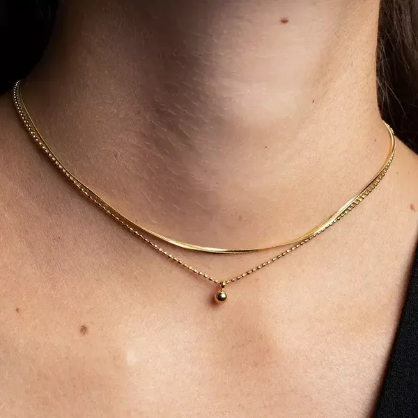 Deze korte ketting is gemaakt van hypoallergeen edelstaal en bestaat uit twee lijnen. De onderste lijn is voorzien van een subtiel hangertje in de vorm van een bolletje. Lengte: ca. 32 cm + 8 cm verlengketting